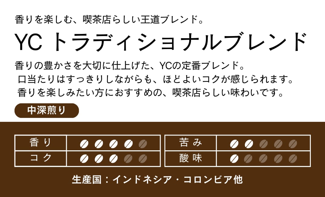 YCでのみ取り扱っているオリジナルブレンドで、長く珈琲館YCで親しまれてきた味を、ご家庭用に小分けしてお届けします。
